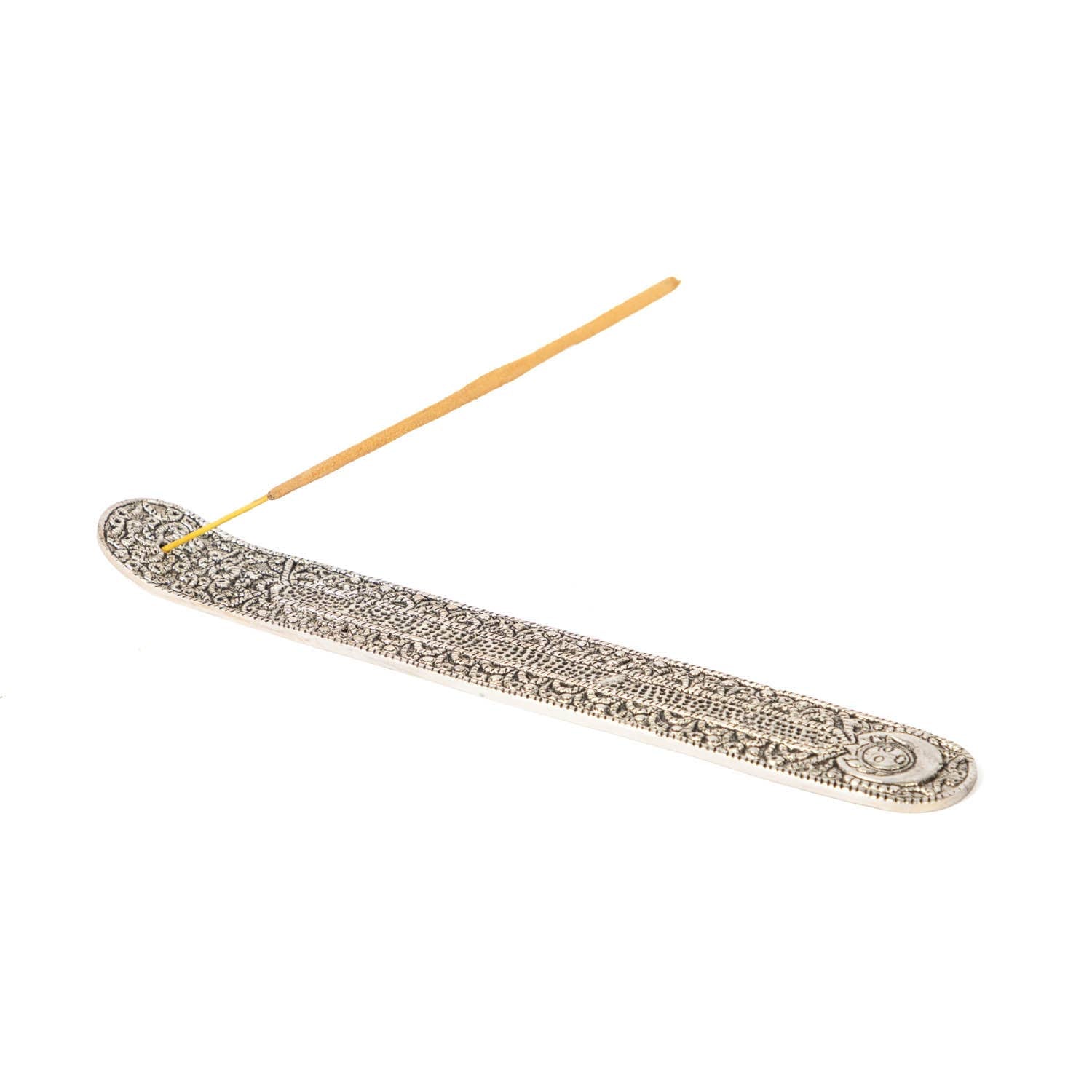 Prachtige aluminium wierookhouder met zilverlook om as op te vangen, versierd met filigraanornamenten in oosterse uitstraling.